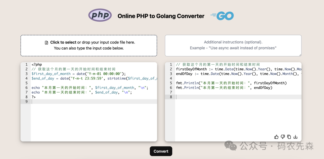 再强大的函数工具库也不可能涵盖所有的场景,随着现在 AI 的盛行,AI 的编程辅助工具也应运而生。在这里我再分享一个免费的 PHP 代码直接转换 Go 代码工具,这个工具简直是 PHP 程序员的福音,直接将 PHP 代码贴上便自动生成了 Go 代码。